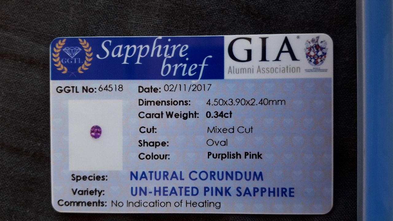 | GEMSTONE APPRAISAL / EVALUATION: | The fair market value appraisal for this purplish pink sapphire, considering its premium handcrafted oval cut, strong saturation, and eye-clean clarity, is estimated to be in the range of USD 250 to USD 350 per carat. Given its unique reddish purple color and unheated nature, the gemstone holds significant value, particularly for collectors and enthusiasts seeking high-quality stones from Sri Lanka. While this 0.34-carat sapphire may not be a traditional investment due to its smaller size, it still holds aesthetic appeal and can be a beautiful addition to fine jewelry. It may serve better as a cherished piece in a personal collection or as a gift, allowing its owner to enjoy its beauty rather than viewing it solely as an investment vehicle. |