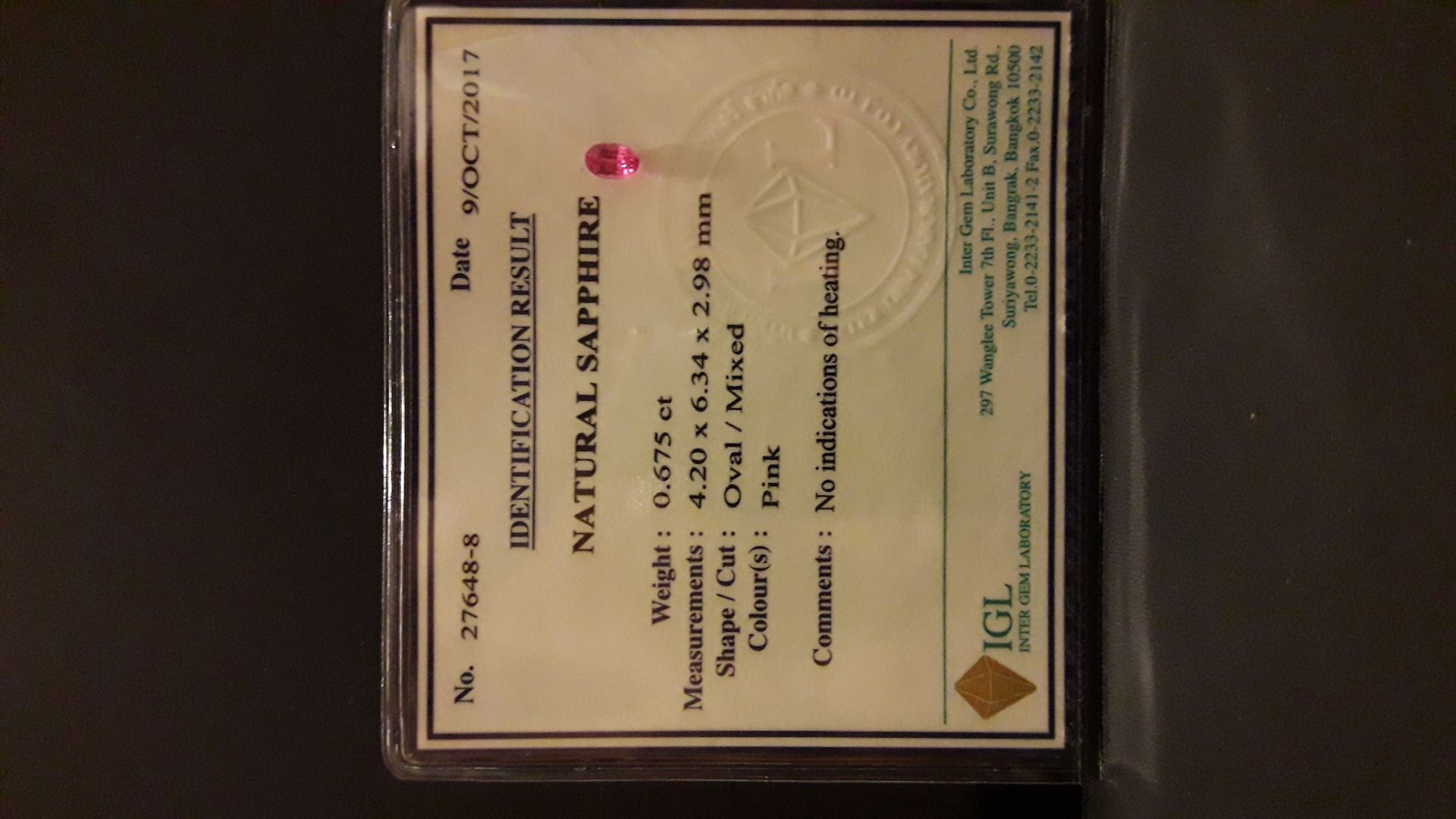 | CERTIFICATE: | and is certified by the IGL/GIA Gem Laboratory in form of a Lab Brief |